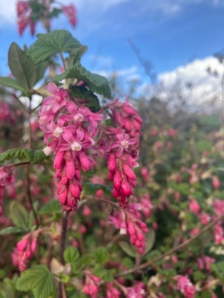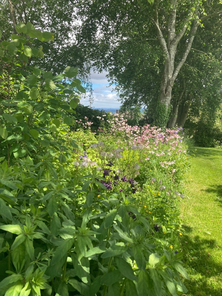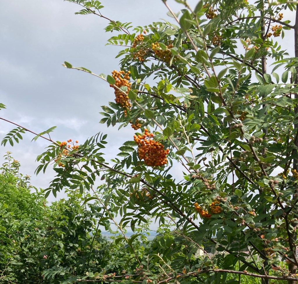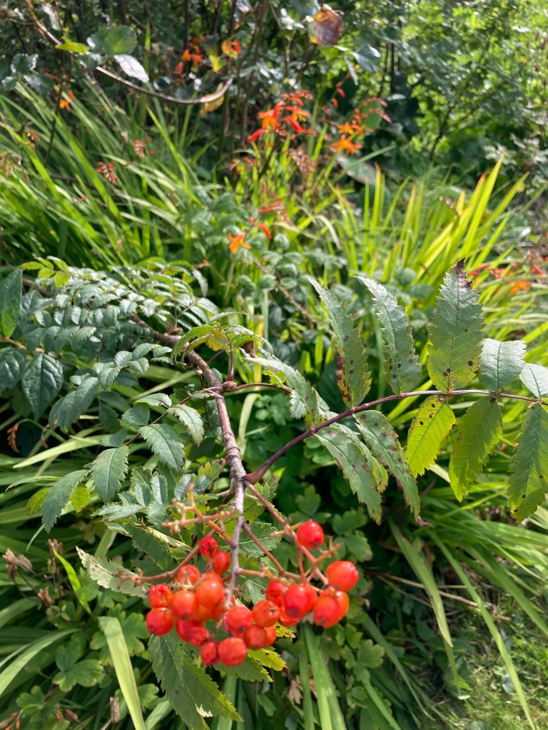 There is an old rowan tree between two beech trees. I think it predates the garden. It’s berries feed the birds and the seeds when dropped in the garden germinate quickly into a myriad of saplings. My mother used to say, “ that’s a rowan, you don’t want it there”. It wasn’t that she didn’t value them. Right plant wrong place! She dug them up and turned them into bonsai trees. I still have one surviving in a pot. So I sometimes dug them out or more often clipped the top off young rowan trees so they didn’t grow too tall. They kept growing and I learned how beautiful they are. First their leaves against a blue sky and their gorgeous orange then red berries in the autumn.