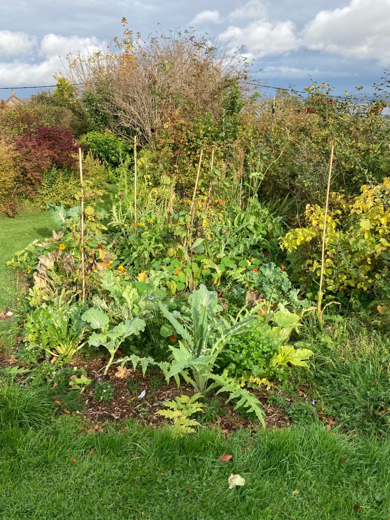 It was a revelation to us that vegetables could be perennial like fruit trees and that they did not require annual digging, sowing, weeding and watering. A resilient, edible landscape seemed like an appropriate response to our concerns about climate change and food miles. Given that our ornamental shrubberies were so irrepressible, how hard could it be to convert them to an edible woodland! Looking at the garden with new eyes the first surprise was that many of the existing plants were indeed edible. But that’s another story.